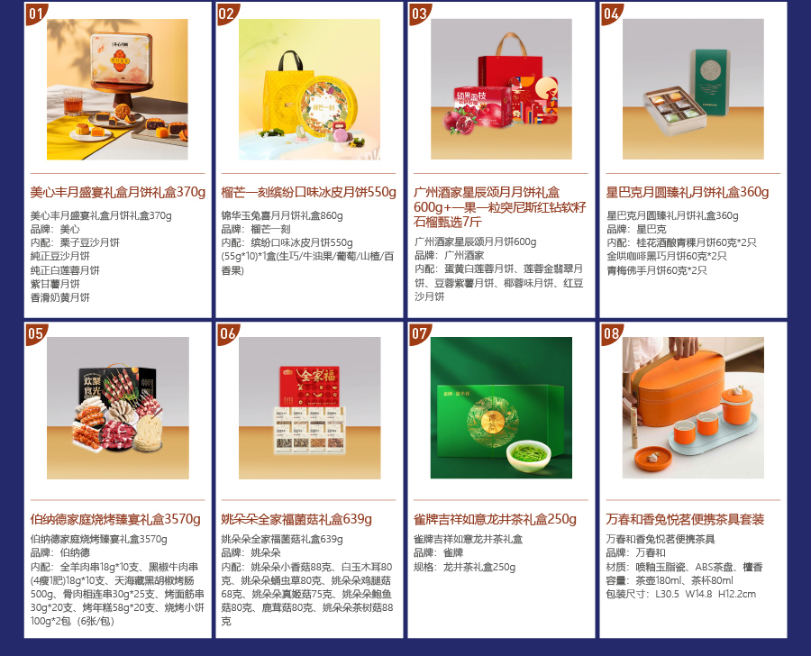 为满足企业客户不同需求,每张月饼券中包含8种礼品套餐组合,持卡人可根据自己喜好任选其中一款,满意度更高!