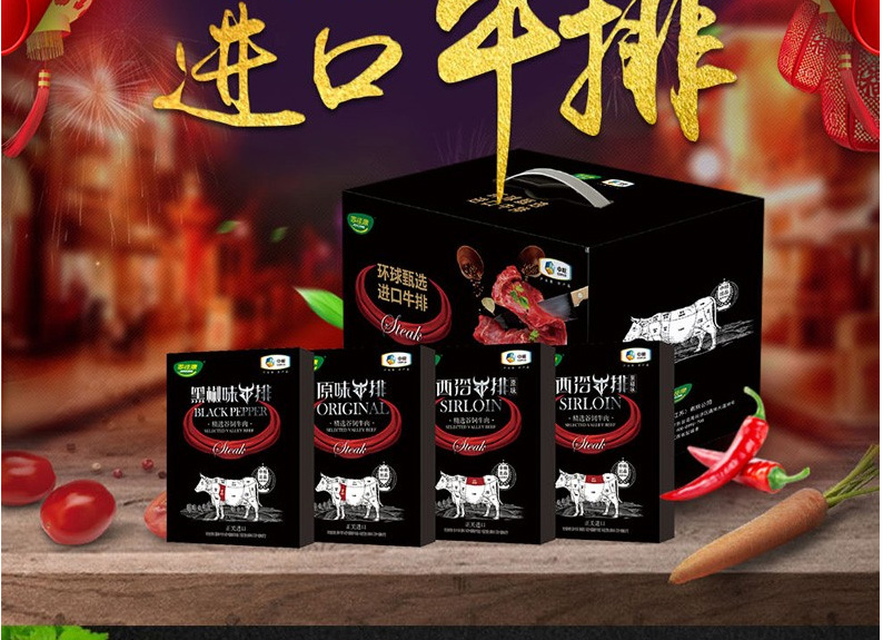 中粮黑椒牛排 160g*1块、中粮原味牛排 160g*1块、中粮西冷原切牛排 160g*1块、中粮西冷原切牛排(黑椒味) 160g*1块