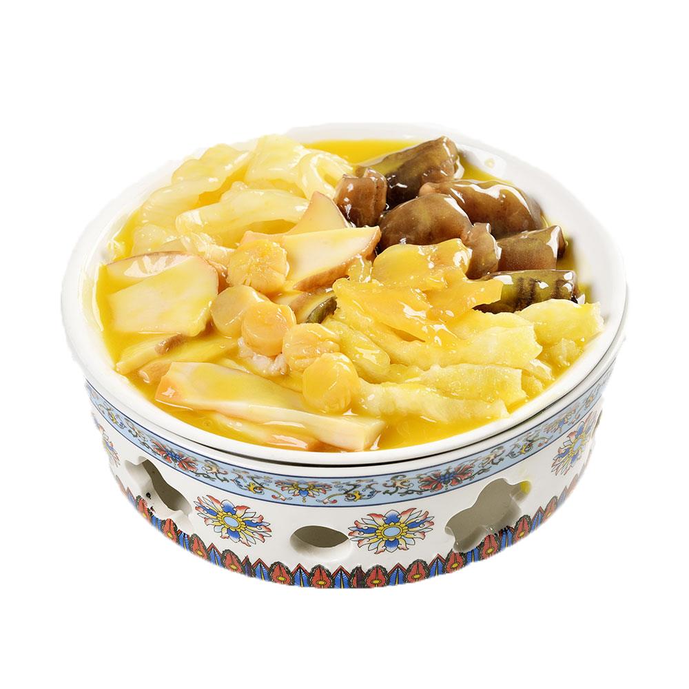 产地:江西 保质期:12个月 贮藏方式:-18℃以下冷冻存储 规格:1500g 食用方法:蒸、煮,熟制后食用 配料参考:生活饮用水、海参5块、鲍鱼5只、花菇、花胶(鱼肚)、牛蹄筋、鲍螺、蚌丝、瑶柱鸡肉、猪肉、冰糖、南瓜、食用盐鸡粉调味料等 配料参考(鲍参翅肚): 固形物含量≥30%
